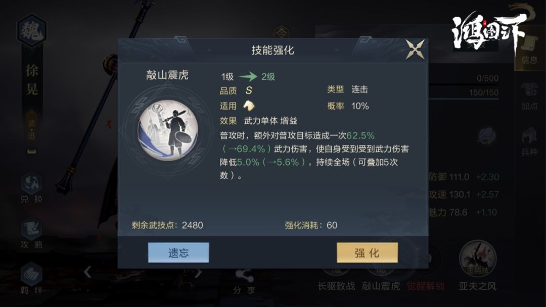 本次新武将中唯一一名步兵将领,六维属性没有太优秀的成长,仅有武力和防御还算合格。除此之外,自带武技与拆解武技的限制极大,两者都必须在进攻时,才能触发,并且后者仅对步兵生效。