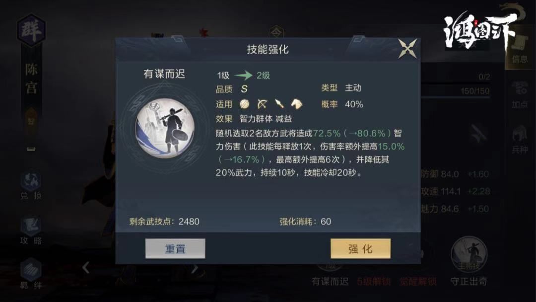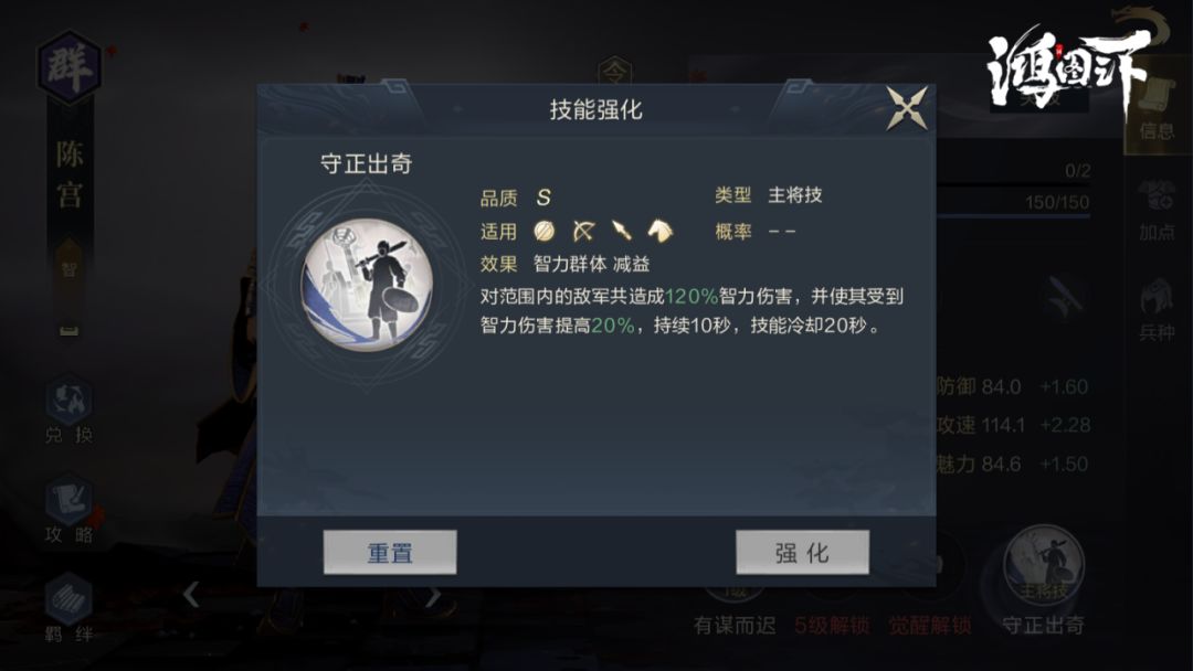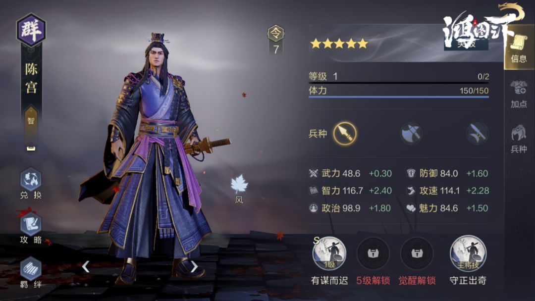 陈宫的定位为智,拥有非常不错的智力和攻速成长,可能会成为新的智力连击将人选。而其拆解武技较为突出,配合上武核队伍,能够打出不错的效果,但作为枪兵将领来说,武力和防御偏低,需要一定的站位保护才能稳定输出。