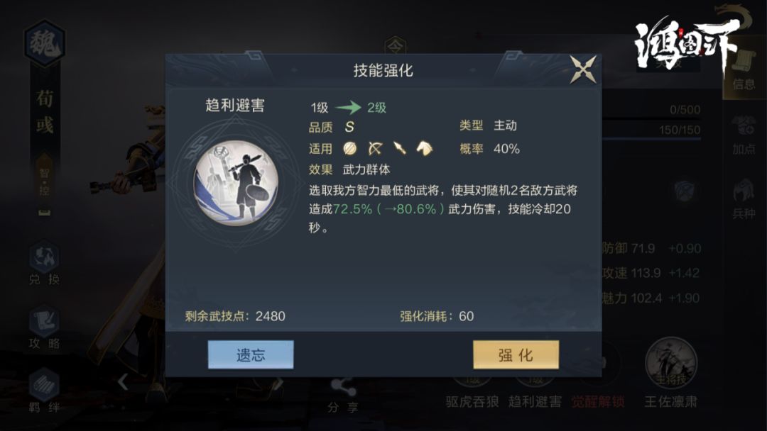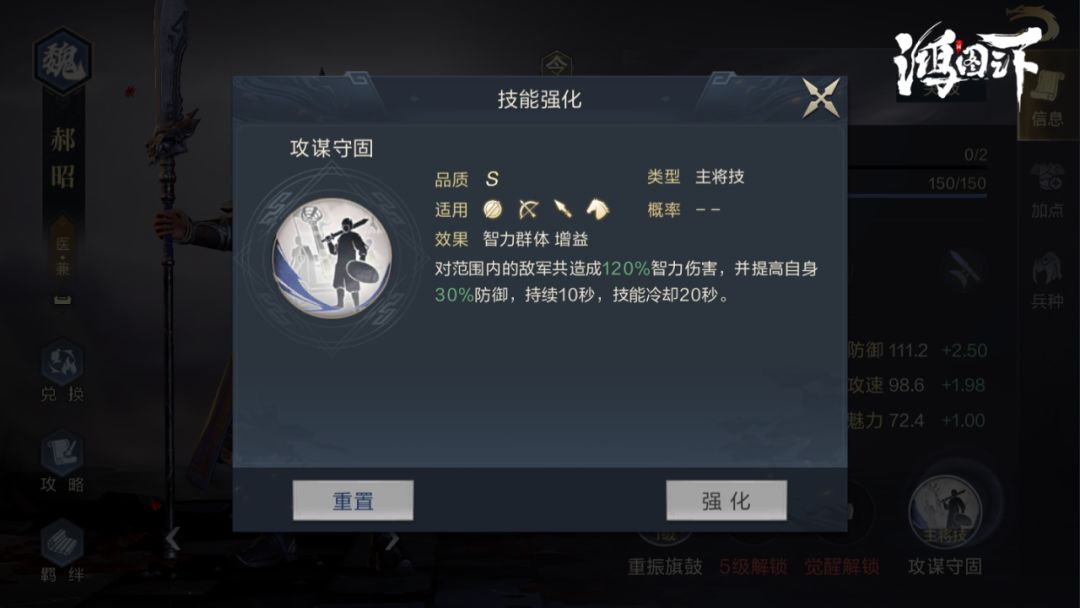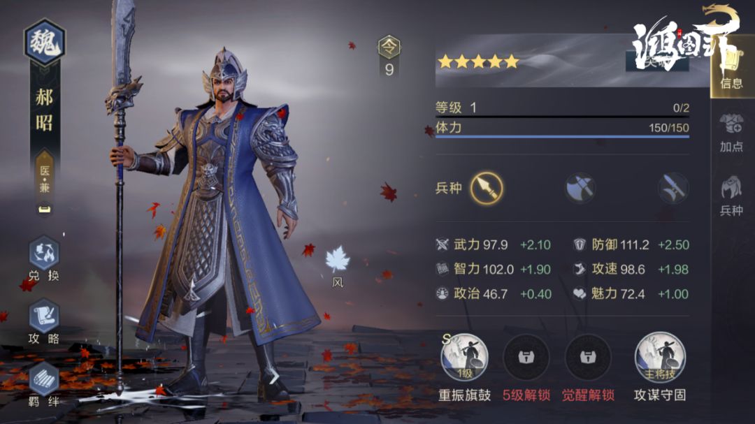 魏国新智将,虽然是辅助定位,但拥有优秀的基础智力、攻速面板,智力成长和攻速成长也属于智力武将中,比较优秀的存在。但武力值和防御较低,在和吕布这类靠武力差距打效果的武将对战时,会比较吃亏。