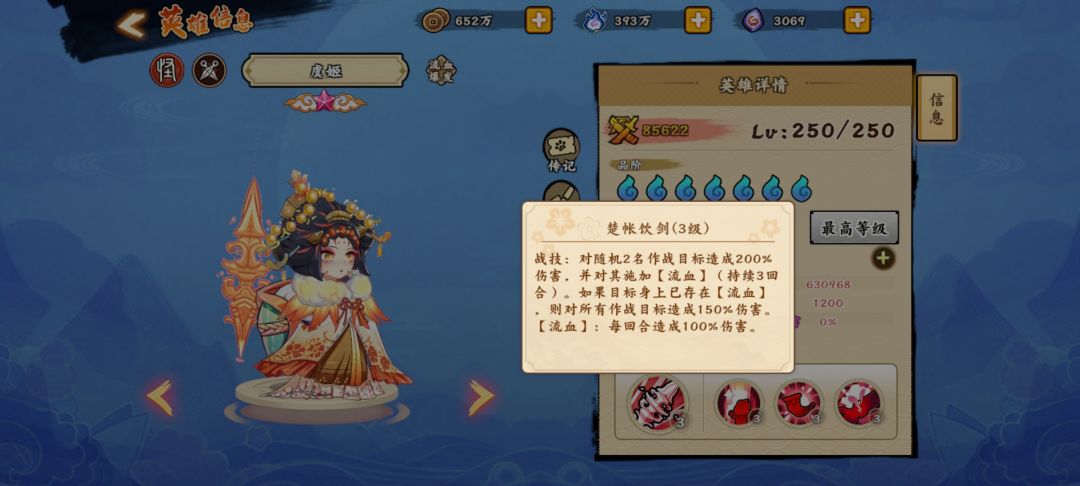大招楚帐饮剑:为敌人添加流血状态的同时,如果敌人身上存在流血状态,则对所有敌人造成伤害,相当于外加两次群体伤害,被动可增加对流血敌人的伤害且回复自己的血量,一个字6