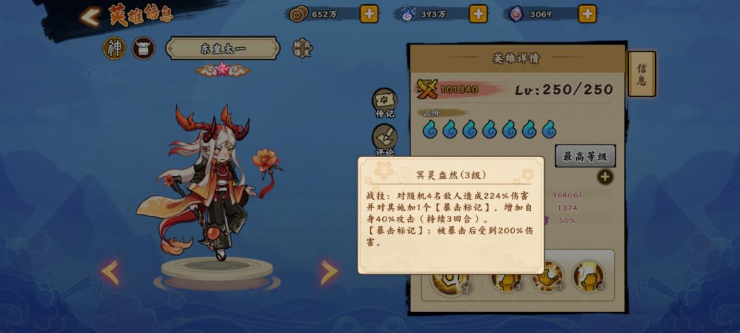 大招冥灵焉然:可为敌人添加暴击印记,被暴击后受到200%伤害,与貂蝉搭配(貂蝉暴击率经技能加成可达60%),且自己的被动技能增加自己35%暴击率,被攻击时为所有敌人添加暴击印记,强强联合,可以说只要你拥有高星级东皇和貂蝉,在游戏中可以横着走