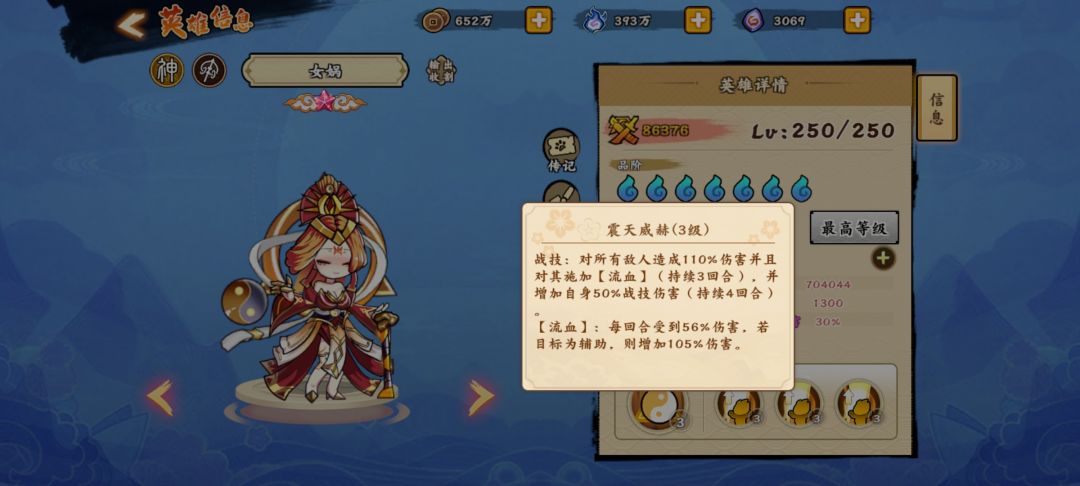 大招震天威赫:为所有敌人添加流血状态,其实女娲单体称不上强力,但搭配虞姬将是所有敌人的噩梦,女娲速度属性高,被动能增加自身速度,只要能在虞姬大招前释放大招,game over