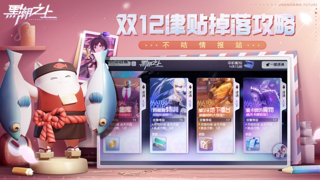 哪里有奖励,哪里就有本喵!作为奖励の引路人,在双12这个双倍快乐的日子里,自然也少不了本喵的身影!在双12活动中,不仅有”物资双倍掉落”、“双12特别热力抽奖”,参与当天开启的特定玩法,还将额外掉落大量津贴,接触者可以用津贴去换取大量稀有奖励。