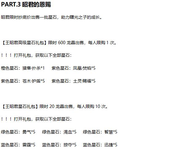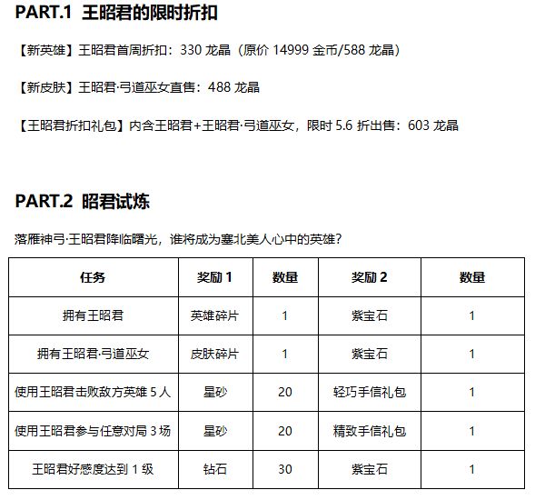 活动期间,王昭君英雄,王昭君皮肤上线享限时折扣,王昭君星石礼包限时抄底价出售,使用王昭君完成一系列任务,获取丰富回报。