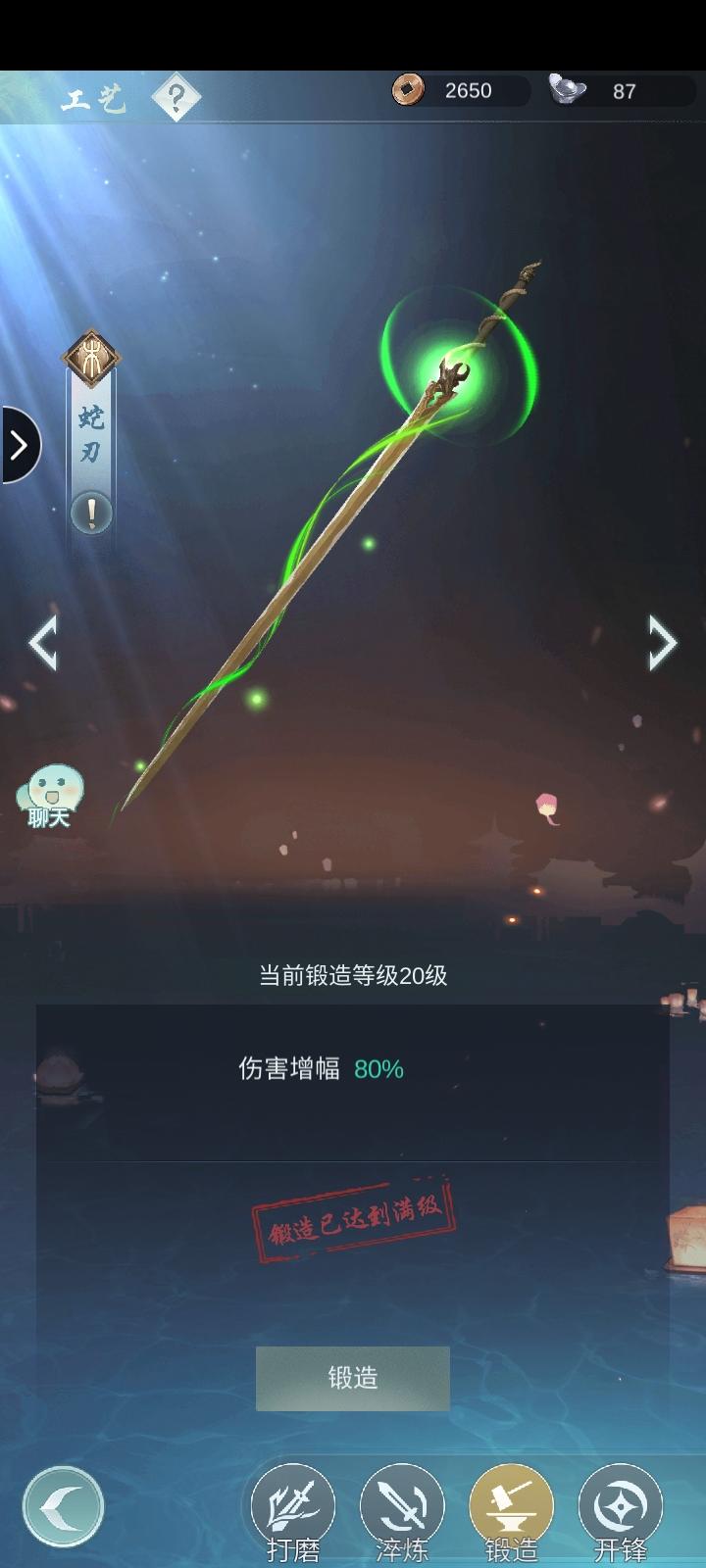 养了太多把武器一把不如一把,因为有了6阶剑招想弄离线面板的结果词条不错的无锋也就比蛇刃多4点面板想了想还是上蛇刃给你们看吧毕竟+20……7上8失败15次然后一口气到20没失败过…后面的后面再说实际战斗力很拉跨因为进阶剑招吃了太多问酒技能招架终结身法都没了