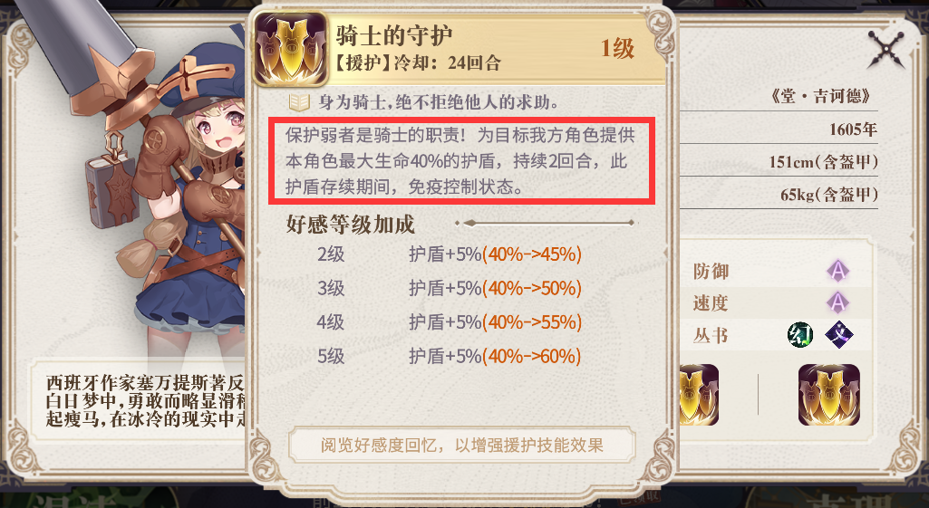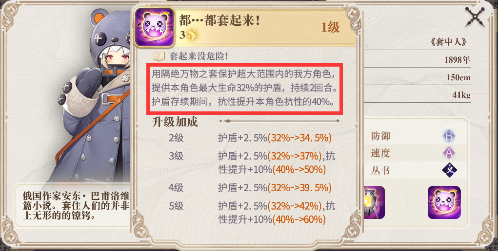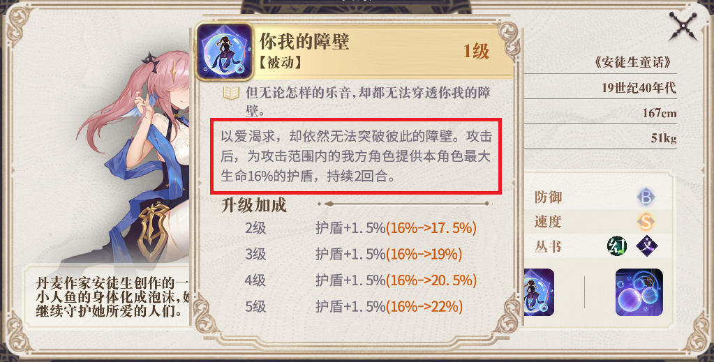 安妮塔的技能可以使自身获得护盾,同时为我方幻书承担伤害。不过她最大的发挥是在援护位,可以为我方单位提供护盾并免疫控制,保后排援护幻书。