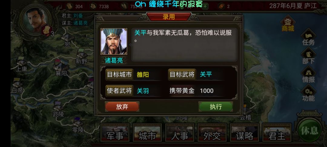 因为我个人是比较推崇荀彧的,我觉得漠视、新秩序、篡汉和伺机而动这几个标签不管哪个打在荀彧身上,他都是不合适的。再补充一下,文若是做过汉臣的,只是董卓进京后才辞官归乡,如果对汉没感情,又何必辞官呢?而后跟了一阵袁绍才又跟的老曹。总感觉这个志向搞的不是很行,猜测的话可能是直接跟了谁就把志向按上去,这样不是很合理吧。还有二爷招关平那个例子,我记得三国志里是关羽长子,演义是义子,不管怎么说算亲人吧,你这亲人招募一下还不来,不仅不来还说毫无瓜葛,二爷:心好痛。亲人或者朋友应该算进征辟的因素里吧?还有一点不知道该不该说,大概因为玩汉末霸业的时候自建武将没对性别做要求,而我也习惯了可能,所以不是特别理解为什么群雄要对自建性别做要求,觉得离谱的话大可以对自建女性的某些属性专门设上限应该更好吧。再催两个功能,一个是类似于离间或者拉拢武将的,怎么说也该搞一个专门降武将忠的手段吧,虽然流言能降,但那东西真的不方便,人一座城里给你囤几十个,你流一年都不一定能降你想降的。还有一个就是结婚或者说赐婚,没这个功能说实话女性武将和男性武将的区别不就在一些专属技能上吗?那我觉得这个性别意义真不大。