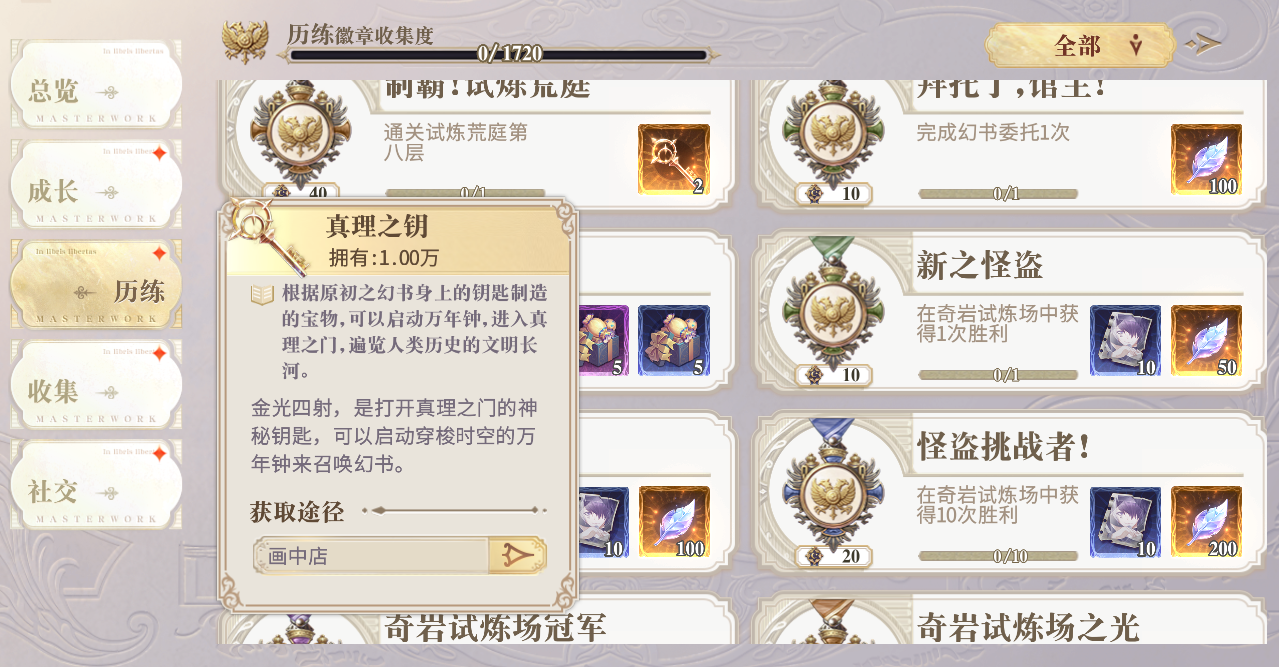 同时真理之钥也可以通过兑换获得,在画中店的奇物兑换中,用奇岩竞技场获胜取得的姬币,以及从学会活动以及守门人培养中获得的学分,都可以兑换钥匙。