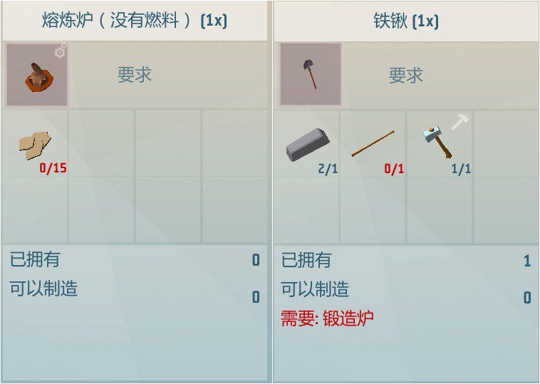 铁锹:铁锭*2,木杆*1,任意锤子*1,需要用锻造炉制作(木杆直接用石刀削一根木棍就可以了)。难点在于先要有熔炼炉,需要先拥有粘土来制作熔炼炉,铁矿来制作铁锭,还需要用各种材料来制作锻造炉。