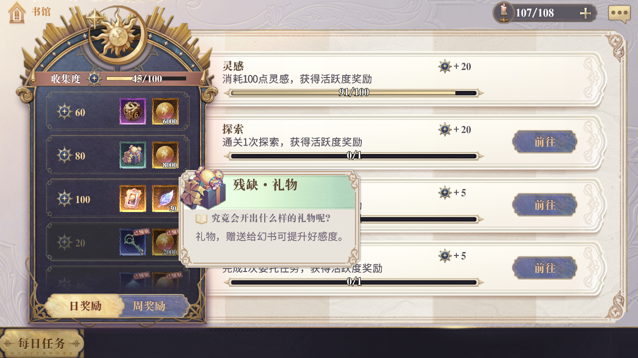 除此之外,在完成每日任务后,通过累计收集度到80点,也可以获得礼物用来赠予幻书。