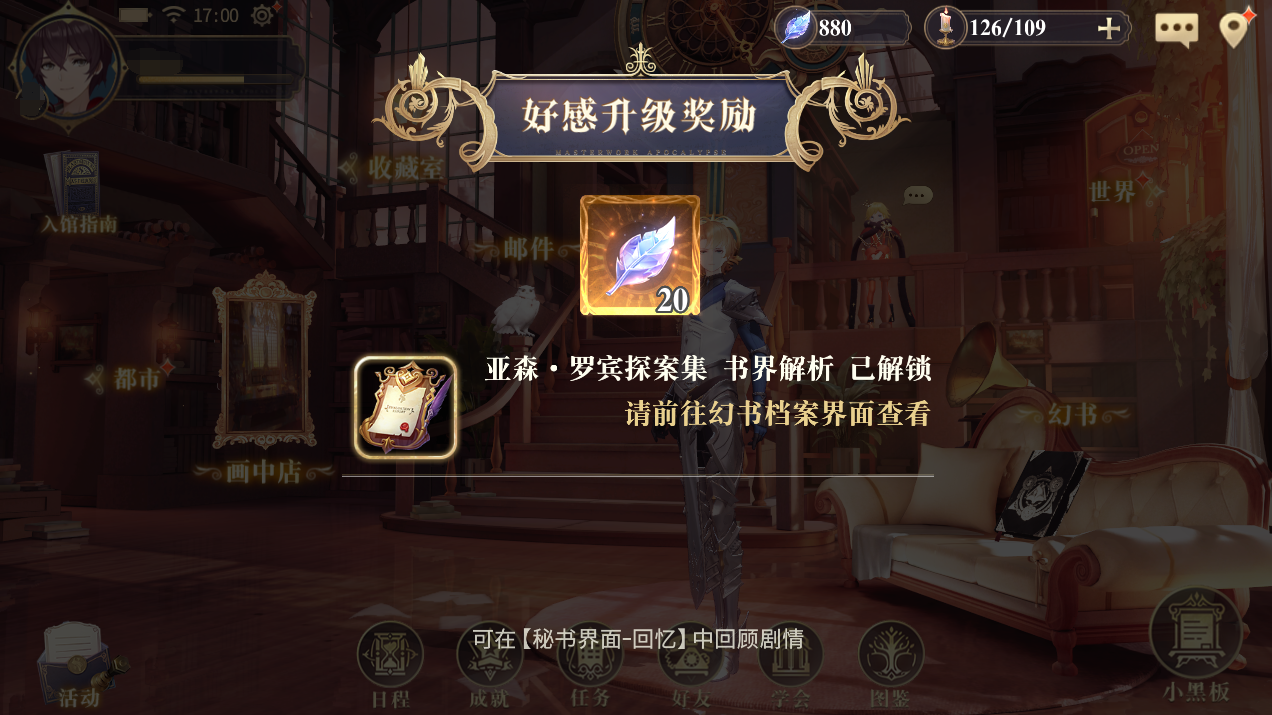 当幻书好感度到达一定等级,会有额外的回忆剧情解锁。幻书会出现在主界面里,此时点击幻书,就可以进入幻书专属的好感剧情,完成剧情后可以获得传世玉叶奖励。好感度等级越高,解锁剧情后获得的奖励就越丰富,除了传世玉叶以外,还能提升幻书的援护技能等级。