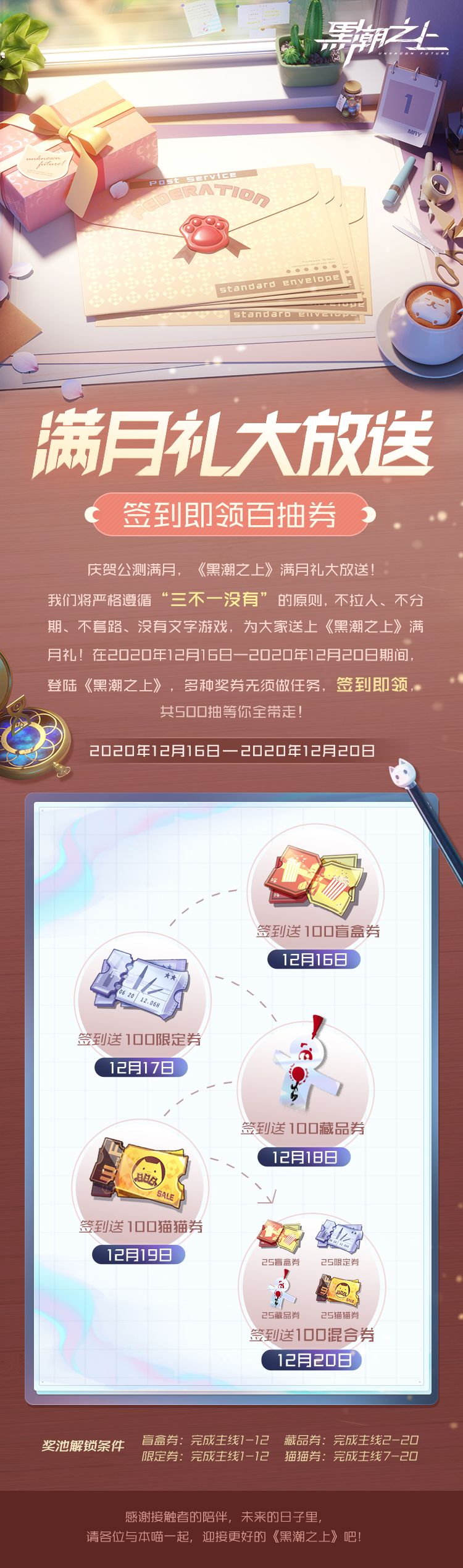 在2020年12月16日——2020年12月20日期间,登陆《黑潮之上》,盲盒券、限定券、猫猫券……每天都有不同的券种解锁,多种奖券签到就送!共500抽等你全带走!