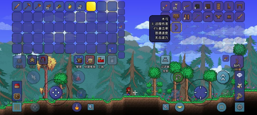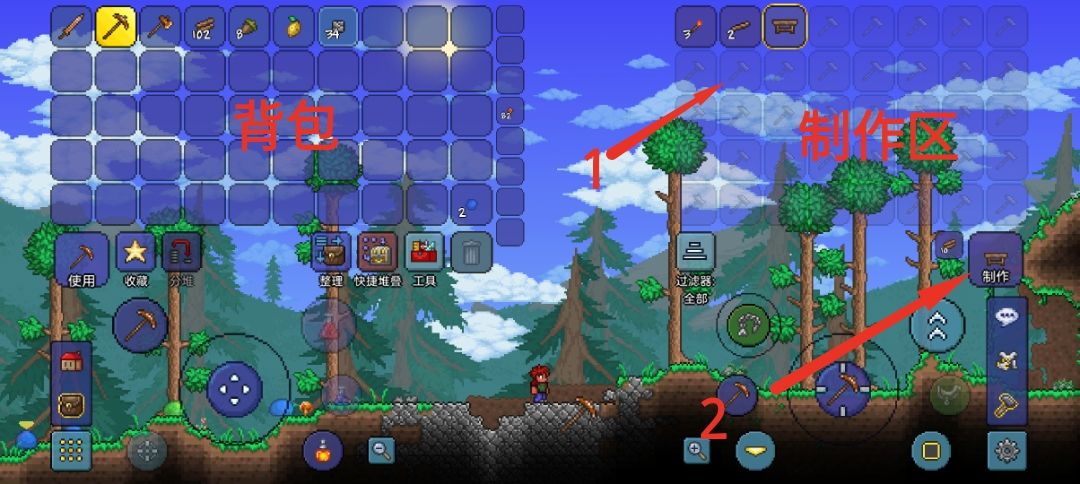 在背包或快捷栏里面选中工作台,直接长按屏幕对准人物附近的地面,工作台就会被放置,此时站在工作台附近,即可看见右边的制作区多出来很多东西,我们按照上面的方法制作一把木弓。