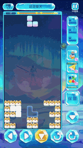 在上海地区的中国馆关卡中,可可爱爱的小柴犬占据了大半屏幕,所以让我们一起来赶走柴犬吧!本关的要点在于需要方块超人先用三角块儿和J块消除上方两行,之后便可用3块方块清除所有柴犬,就可以达成3星啦!
