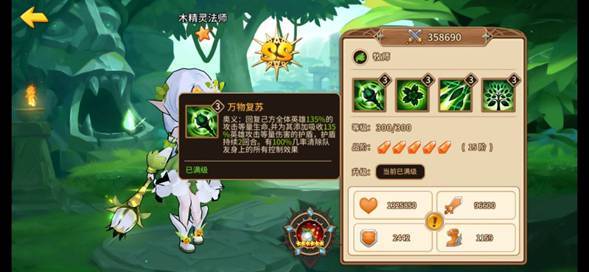 风系阵营的木精灵法师,技能“万物复苏”不仅能恢复己方英雄100%攻击等量生命,还有60%几率清除队友身上所有控制效果。