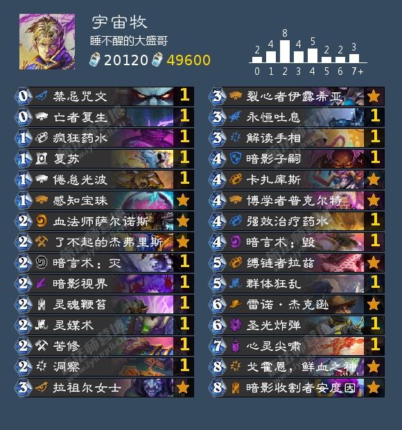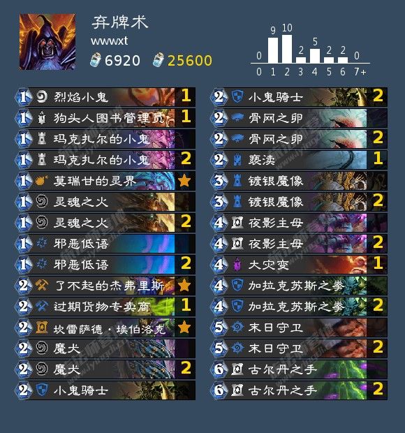 来自 wwwxt 的一套弃牌术,他以87场61%的胜率打到了传说四千名。构筑上这套弃牌术没有选择传统的虚空行者和地狱犬,而是加入了一张亵渎来应对狂野奇数骑以及一众铺场快攻。四费阶段可以骨网之卵加亵渎,只要场上有一血怪存在,就可以稳定触发至少三次亵渎效果,可以很好的应对场面压力。对于弃牌术后期无力的问题,让出了一个卡位给杰夫。虽然这不是一套宇宙卡组,但由于其飞快的过牌速度,后期很容易实现宇宙。(只要不被弃掉) 大灾变配合玛克扎尔小鬼也可以解场加换一手牌。 对于无法应对的场面可以选择留古尔丹之手一类弃牌赠益卡,直接大灾变。虽然这套卡组为了应对环境增加了亵渎和杰夫,但这两张并不是核心,该用的时候就用。不要贪姐夫的战吼,卡手的时候也可以当做迅猛龙站场。