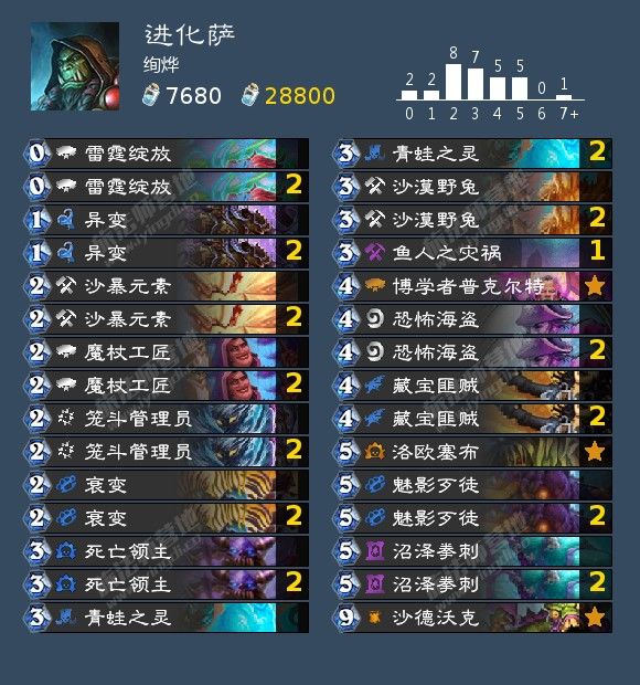 打法上起手笼斗管理员必留,没有的话可以留刀,有刀可以留恐怖海盗,有任何异变卡(包括硬币+蛙灵)可以留沙漠野兔和魅影歹徒;打快攻留沙暴元素,衰变和死亡领主;打慢速留博学者,有博学者的话还可以留一张藏宝匪贼。这套上手很快,胡起来无敌。不过对抗快攻需要一定的大局观,提前规划好费用和血量,然后靠羁绊提刀进化出嘲讽,吹起反攻的号角。