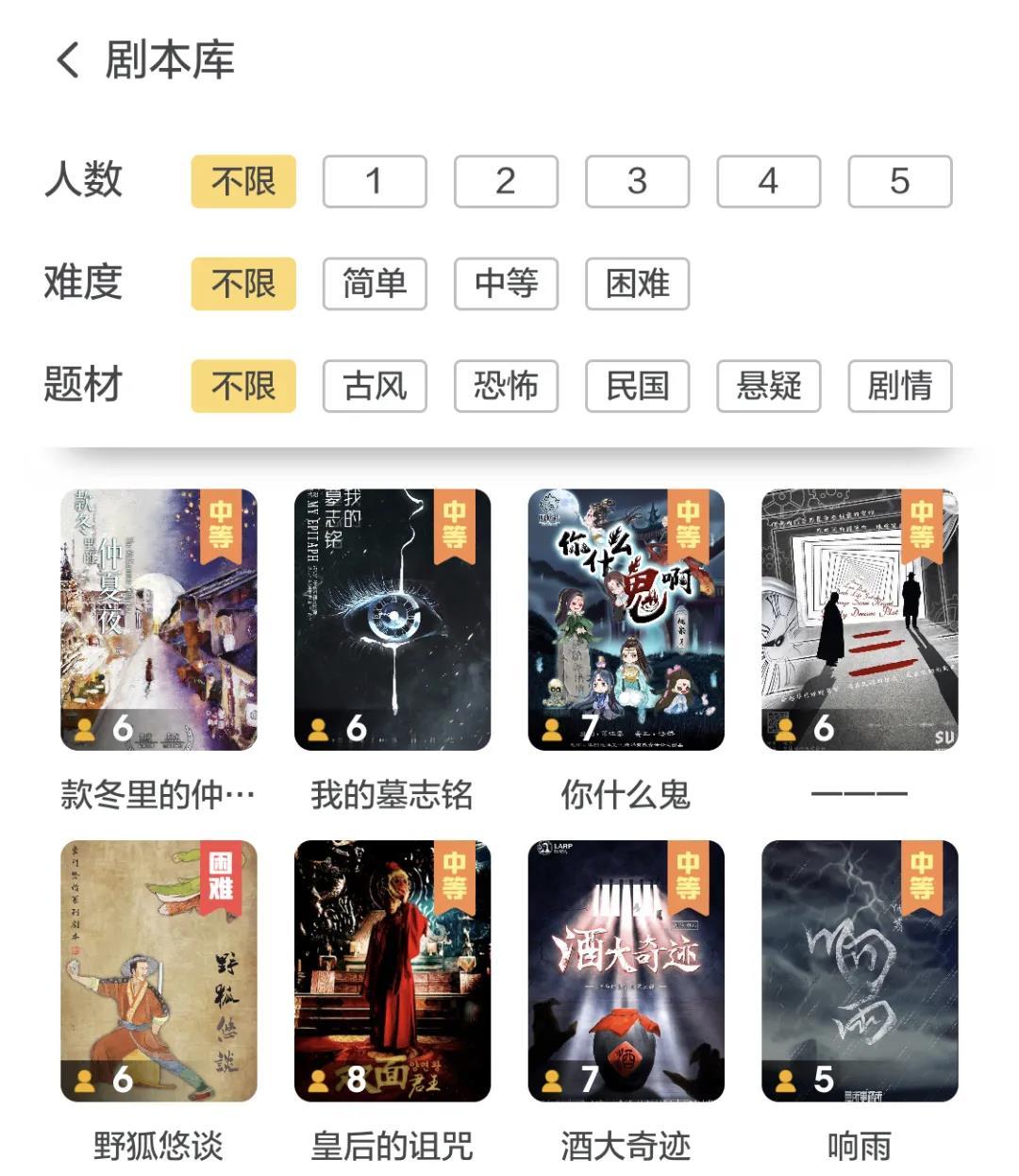 如果没有心仪对局,玩家可点【创建对局】按钮,进入线下剧本库,自主筛选创建对局。