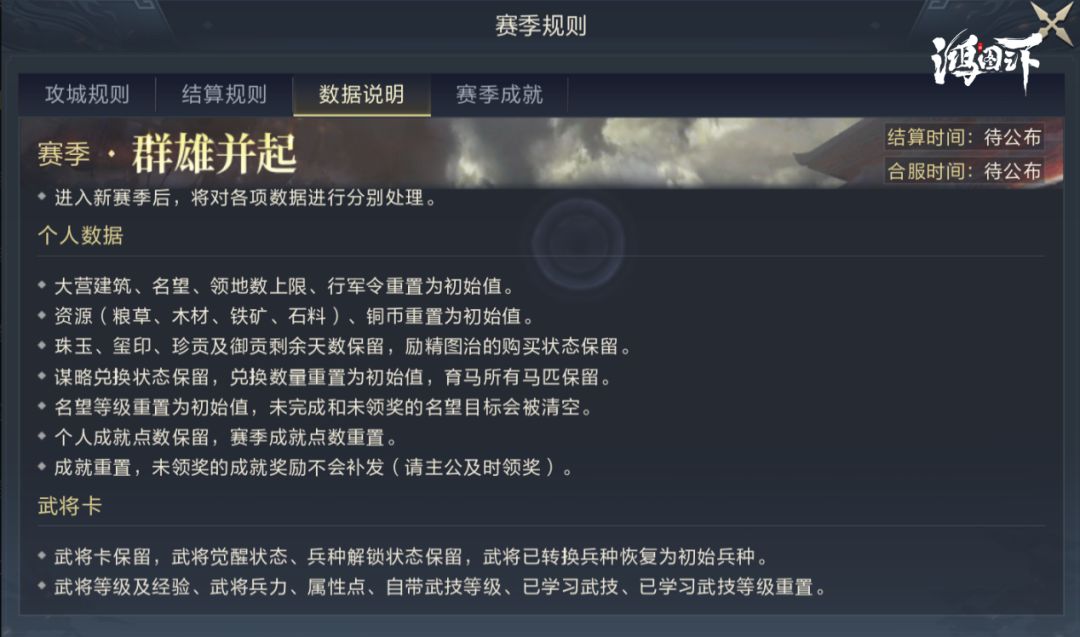 从S1赛季过渡到S2赛季是有一个过程的,在S1赛季结束后所有玩家的个人数据都将得到重置,如主城等级、资源数量、领地等等设施建筑会被重置,但武将和武技只会重置等级,觉醒状态和兵种解锁都将得到保留,武技点会被清空,具体可在游戏中“赛季规则”里查看。