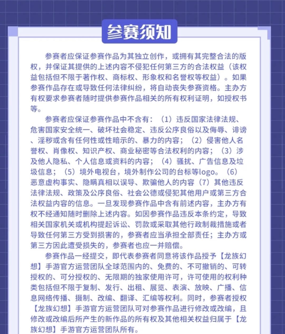 4.违规作品:参赛者应保证作品中没有抄袭、盗用、涉黄及其他违规行为,如参赛作品违反相关规定,官方有权取消其参赛资格;