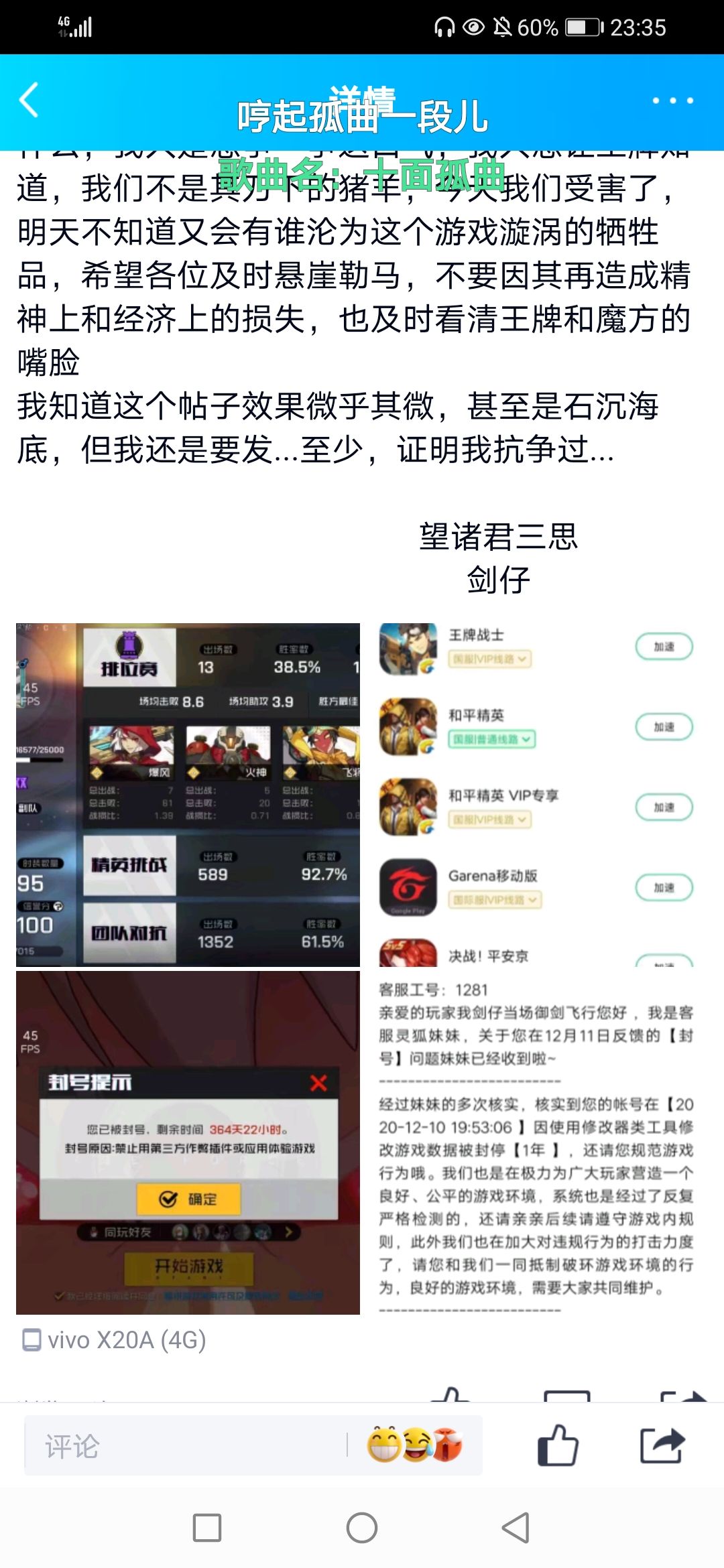 但是呢,王牌做了什么,伤了多少玩家的心,前些日子180的天价镰刀,缩减王牌通行证的皮肤,拖了又拖还体验还不咋滴的推车,大家都历历在目,如今更是卸磨杀驴,因为加速器被封号的受害者已经不止我一个了,还有其他玩家也有因为加速器被封号的例子