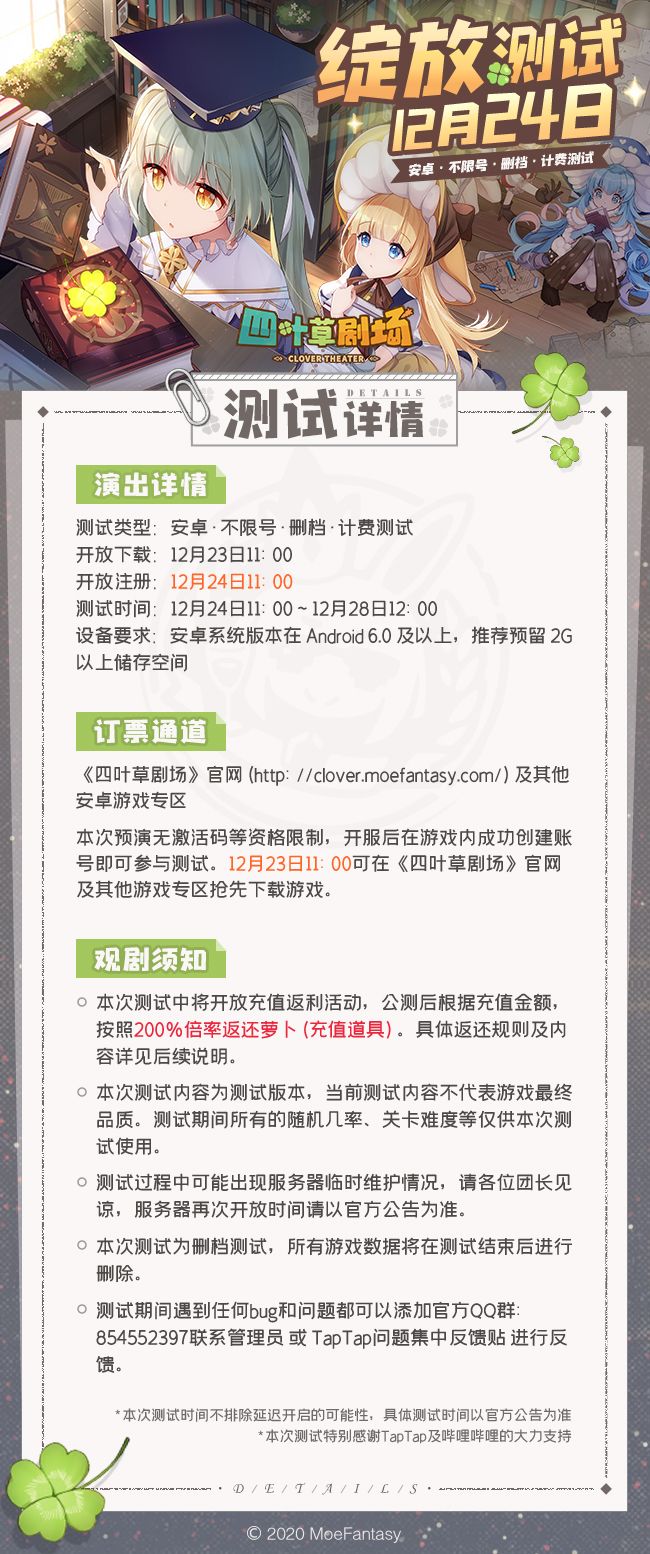 本次测试无激活码等资格限制,开服后在游戏内成功创建角色即可参与测试。12月23日11:00可在《四叶草剧场》(测试服)抢先下载游戏。