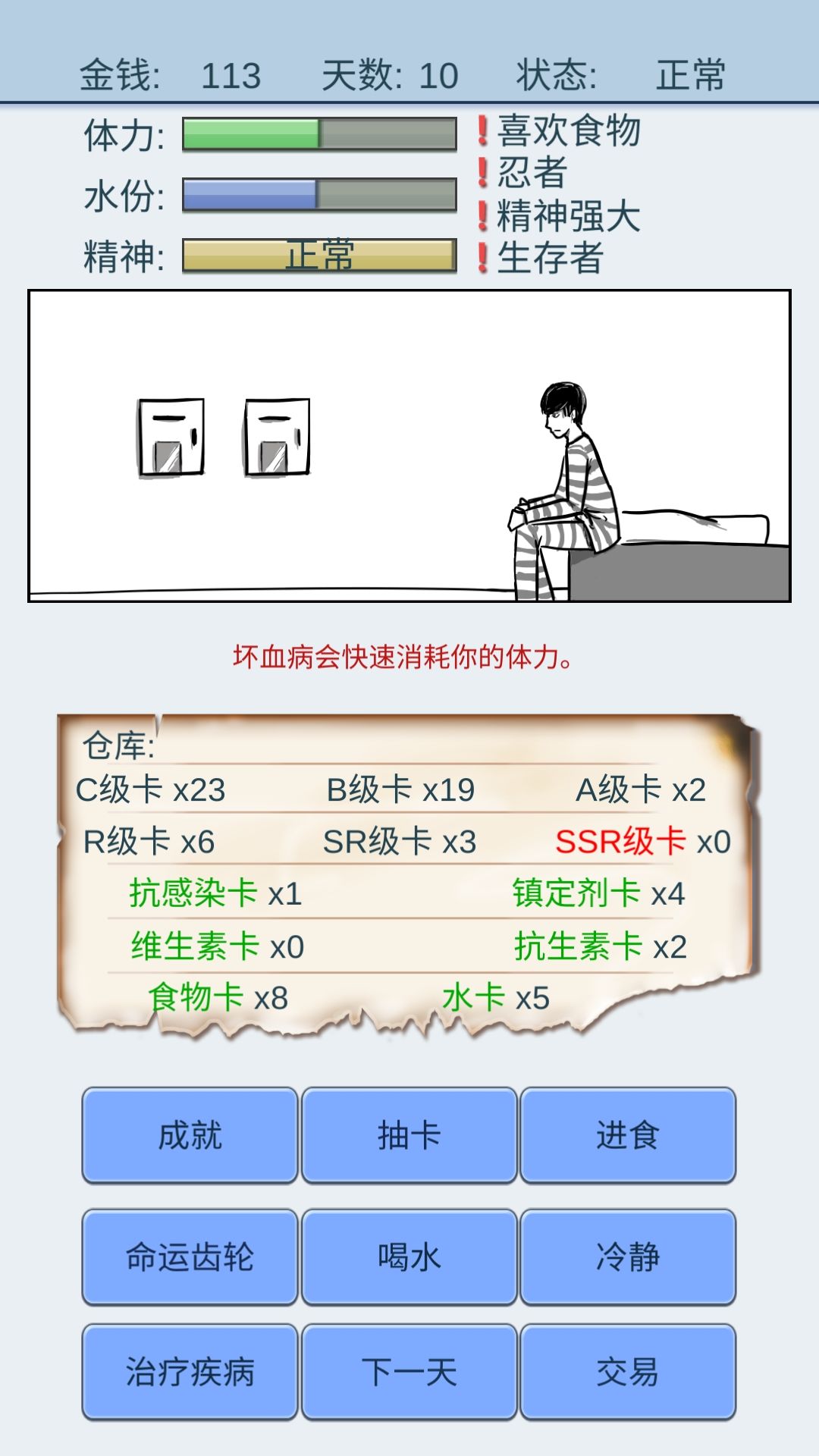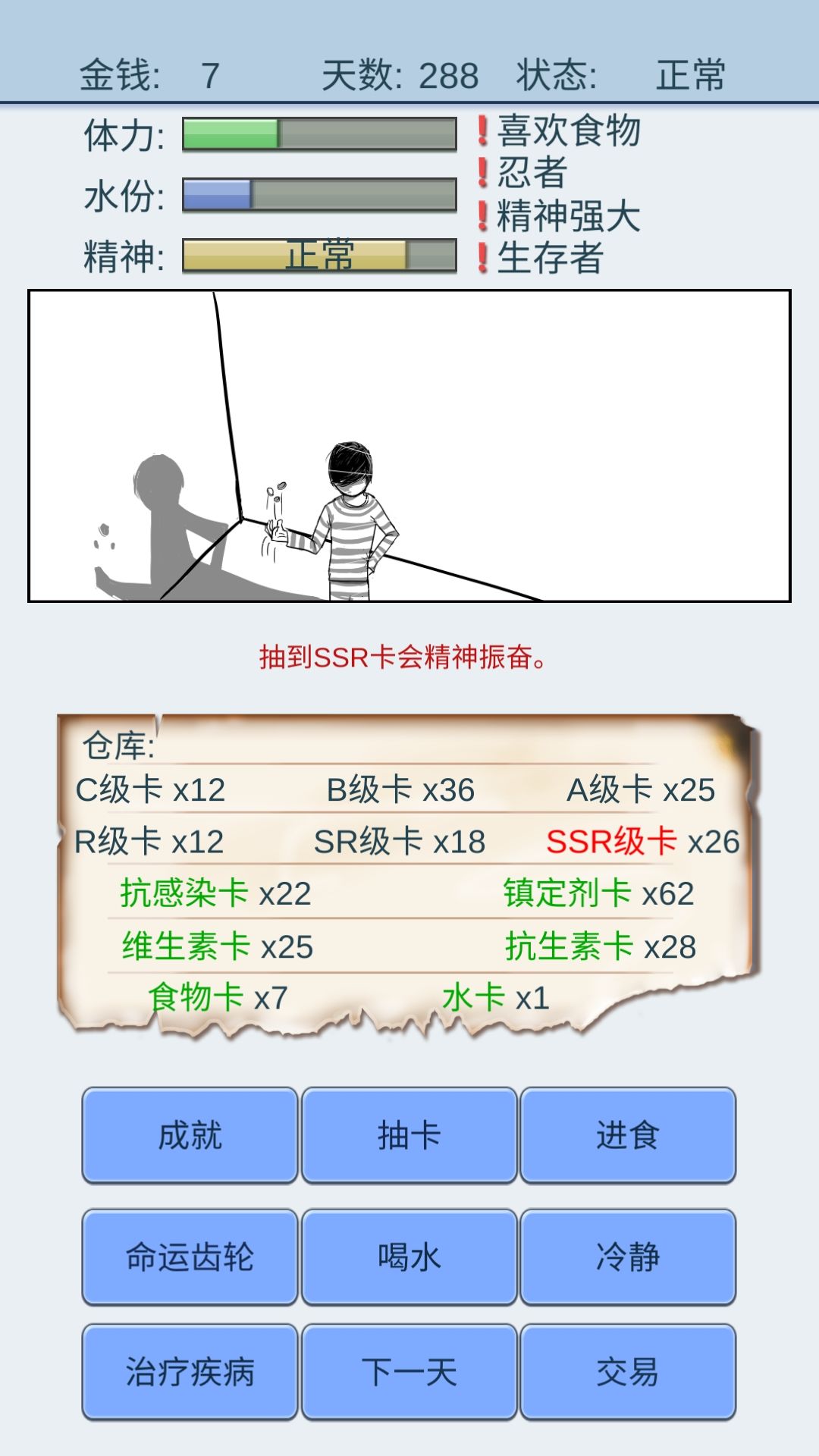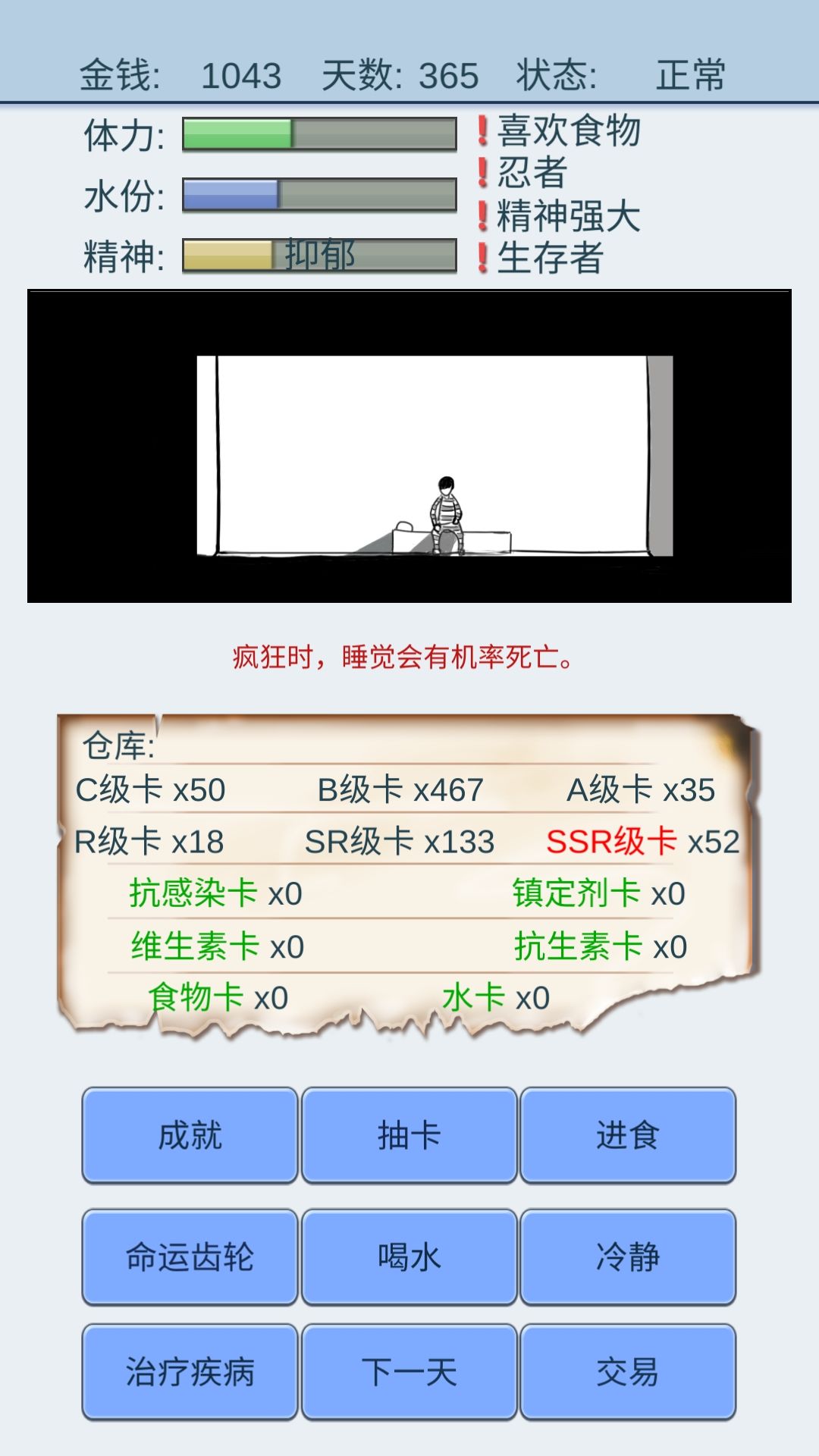 四个特效一定要都是正面的,并且至少有一个是容易获得食物的,不然靠着商人,你或许能活到行刑日,但你要累死,我通关复活了一次,728天爆种结束战斗。