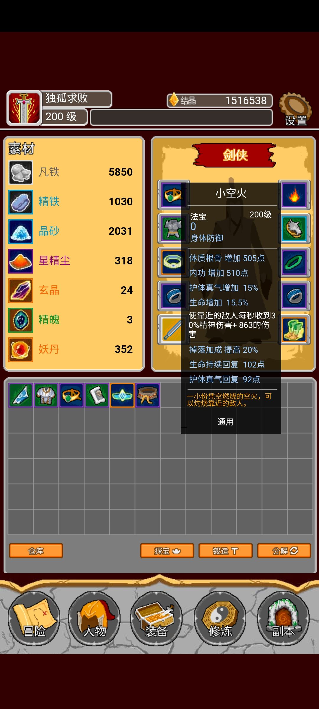 今天突然发现一个混伤小空火套路,当然还是以精神伤害和内功为主!用技能蝉鸣近身怪物真火伤害贼高!技能:8蝉鸣+1格挡+6踏云+1剑神+2震八荒+2绝剑鸣