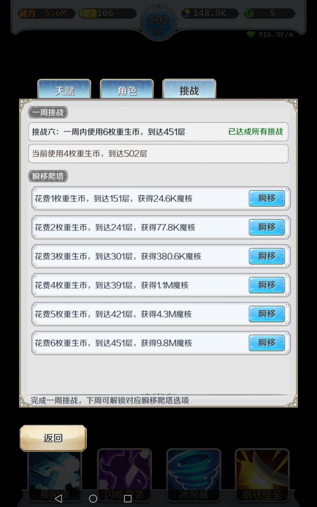 所以每周都没有用瞬移而是从零爬塔,1倍速自动,然后极限层用手动冲层试炼塔4币501达成,部分1倍速手动冲层