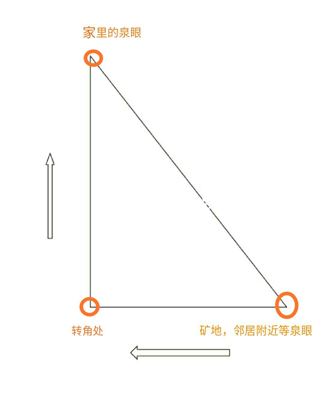 沿途40格看见泉眼都扔一个石头放上面,这里就要注意沙漠和雨林中没有,中间可能空了几十格有点远,要来回确认一下是不是直线。当这条直线和你的家标垂直时,就可以垂直往家里跑了。记住,在转角处做好自己的标记(可以用尖石代表方向,在两个方向上放个尖石)。