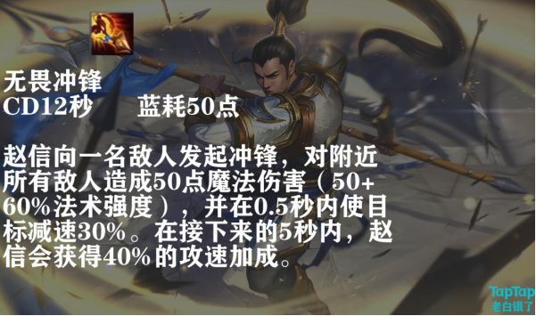 赵信的3技能是一个指定目标的位移技能,使用后会向目标冲锋并在范围内造成aoe伤害,对目标施加减速的debuff并给自己加一个增加攻速的buff,这个技能非常适合用来进场,陷阵之志,有死无生!