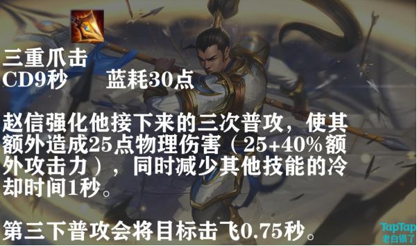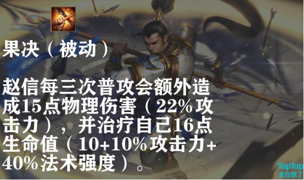 赵信的被动技能是强化自己的每三次平A,使其造成额外伤害并提供治疗效果。平A是赵信输出的主要手段,因此这个技能对赵信的输出能力和续航能力都有不小的提高。
