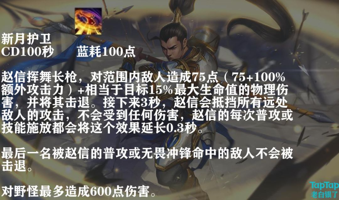 赵信的大招和2技能一样,可以依照名字拆成两段来看。其一新月,就是赵信长枪一扫划出一道新月,对范围内的敌人造成高额伤害并他们统统击退。其二护卫,就是赵信扫出新月之后,他将会抵挡一定范围内所有从范围外打过来的攻击,使自己和范围内的队友都不受伤害,持续时间还会随着他的攻击而延长。值得注意的一点是,最后一名被赵信平A或者无畏冲锋命中的敌人不会被击退,也就是说在团战时赵信可以利用无畏冲锋突进到对面C位脸上,然后一记新月护卫把C位周围的敌人统统扫飞,以此创造对自己有利的单挑局面。