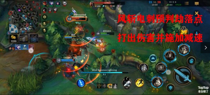 赵信的2技能分为风斩和电刺两段,风斩可以横扫的赵信身前较近的敌人,而电刺则会穿刺赵信正前方较远的敌人,两段技能都会对命中的敌人施加减速,而伤害方面则是电刺更高。