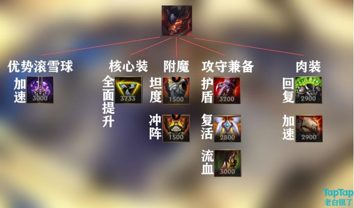 赵信的出装一般是往常规的重装战士方向走,核心装是三相之力,推荐第一件出,如果前期优势过大,也可以选择先出幽梦滚雪球。出完这一到两件输出装之后出血手提高我们的生存能力,后续根据对面的伤害类型补绿甲和亡板,最后一件出复活甲提高团战容错率,复活甲CD的时候可以将其换成死舞。鞋子附魔依情况而定,想抗更多伤害就选石像鬼石板甲,想冲阵开团就选正义荣耀。
