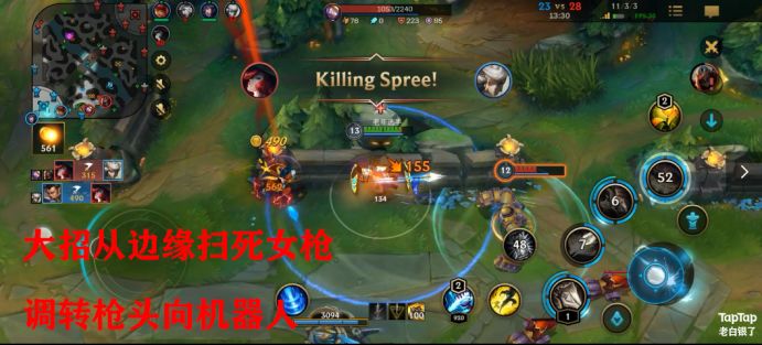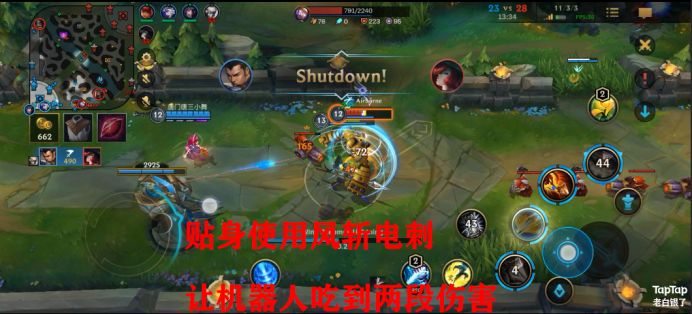 近身机器人后我方安妮也赶来支援,老白近身使用风斩电刺,让处于技能中心位置的机器人吃到了两段伤害并受到减速,最终被老白和安妮联手击杀。