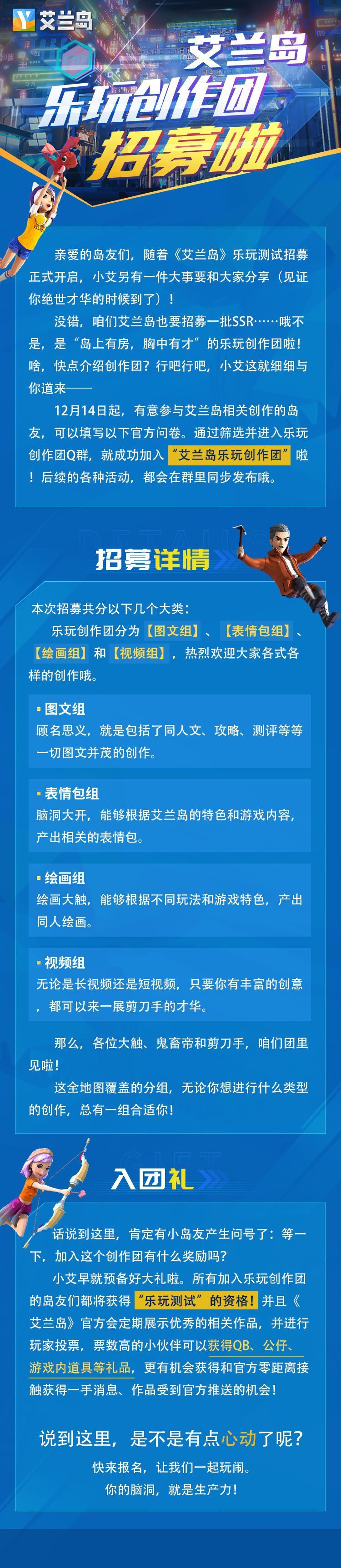 亲爱的岛友们,《艾兰岛》乐玩创作团开始招募啦,请看下图了解详情招募问卷链接
