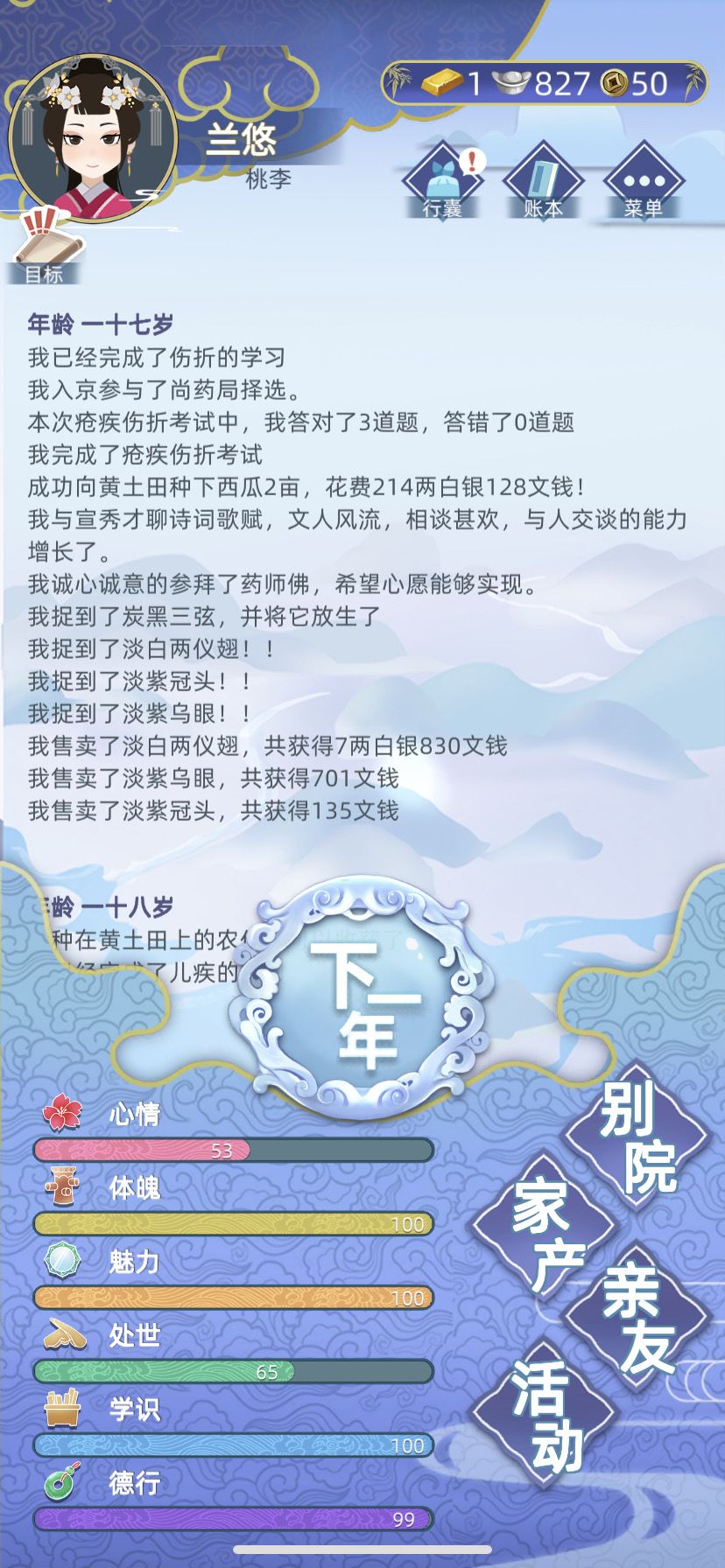 天赋只有个老杏悬钱。新开的一个人生,头像好看,父母也有钱,母亲都是给一个银子起步🤑还是嫡长女,顺理成章父母同意我入宫学医。❌拒绝结婚。抓促织也运气爆棚抓到了个三星的好像反正卖了一金多瞬间有钱。后来入宫尚药局考试就是看攻略都是通过了,最后列为甲下,当了侍药。之后就是捐药材,看病,刷政绩上80或85就能升职了。25岁主药—27岁医佐—30岁司医—31岁直长,侍御—32岁奉御