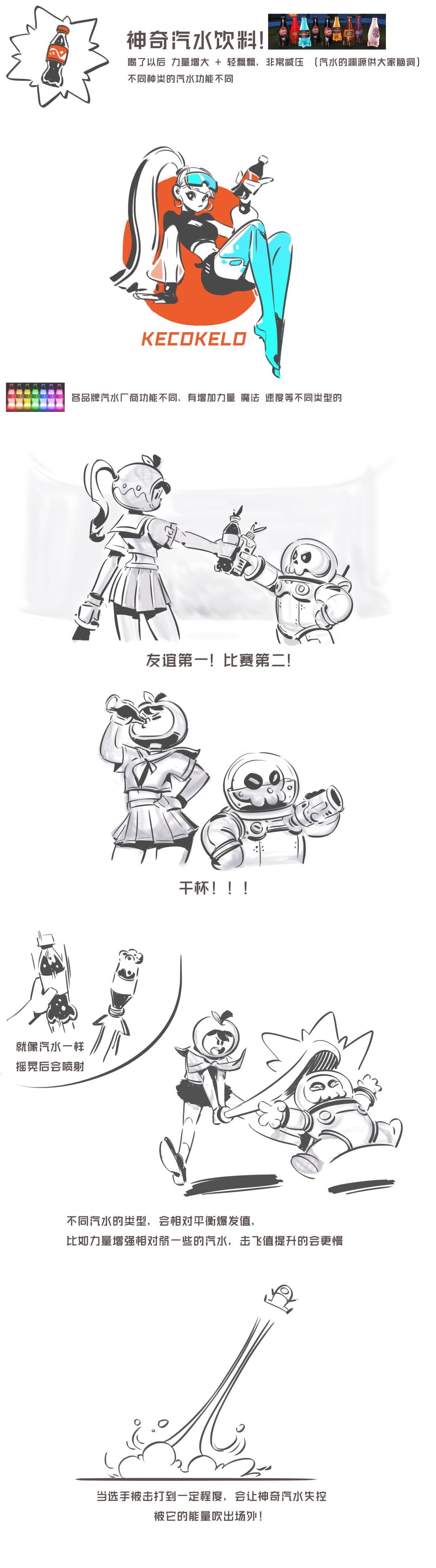 我们还讨论过其他价值观的世界。譬如一个存在各种品牌的汽水的世界,喝了之后就会有不同的效果。但相同的是,随着大家战斗,汽水会不断在肚子里晃动,从而产生大量的二氧化碳,然后超过临界值时会被喷射出场地外。