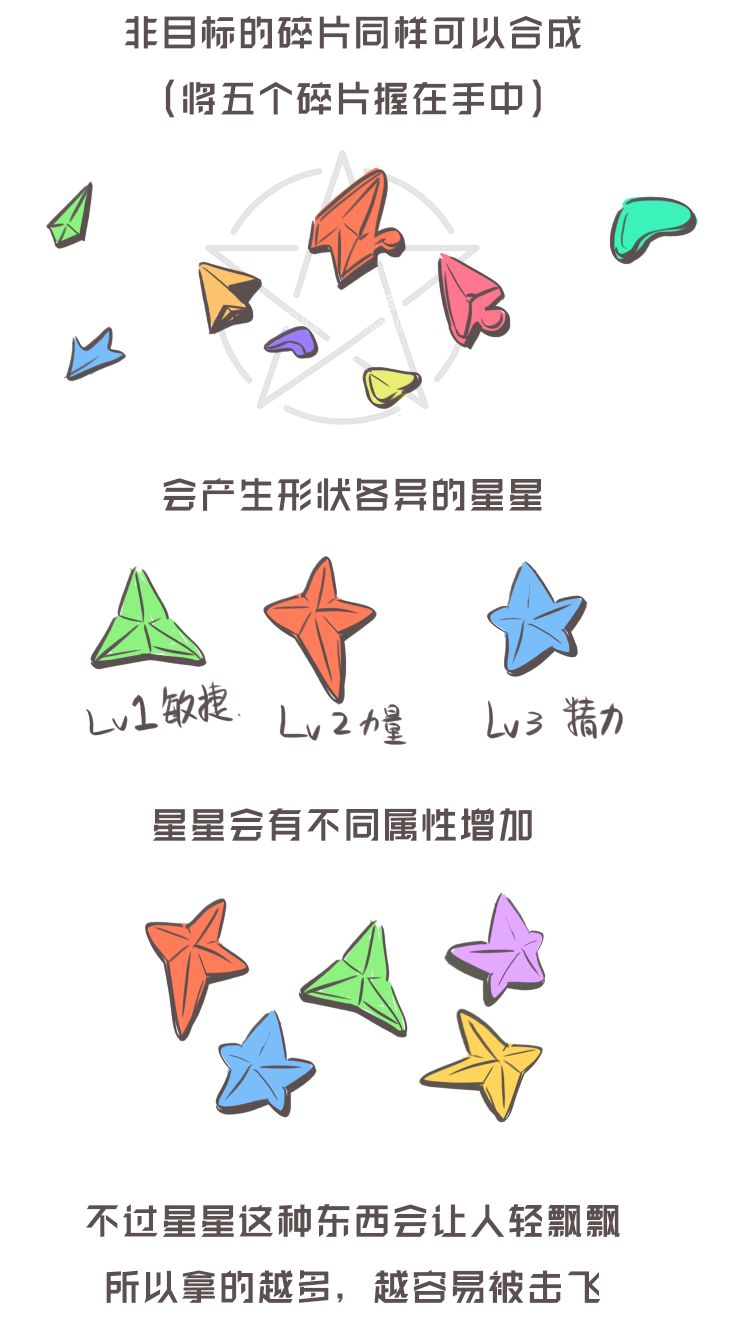 参赛者会受到星星力量的一定保护,力量会因个人差异而提升,当头上的百分比越高时,会更容易被击飞场外,片刻后会返回场内。如是两次,当第三次被击飞的话就会在场内留下自己的星星碎片。当然获得碎片的方法除了击飞,也可以赠与,赠与后玩家自动退出比赛,恢复“平民”身份,平民身份会得到保护,在游戏范围内不会遭到玩家攻击。