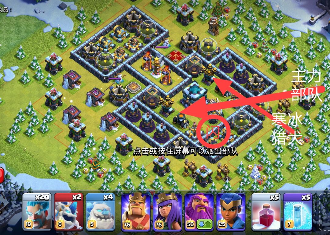 第一步:5个圣诞奇袭放在图示位置,会闪掉土炮,闪不掉连弩(为了清边和减少地面输出,让蛮王开墙进大本营)