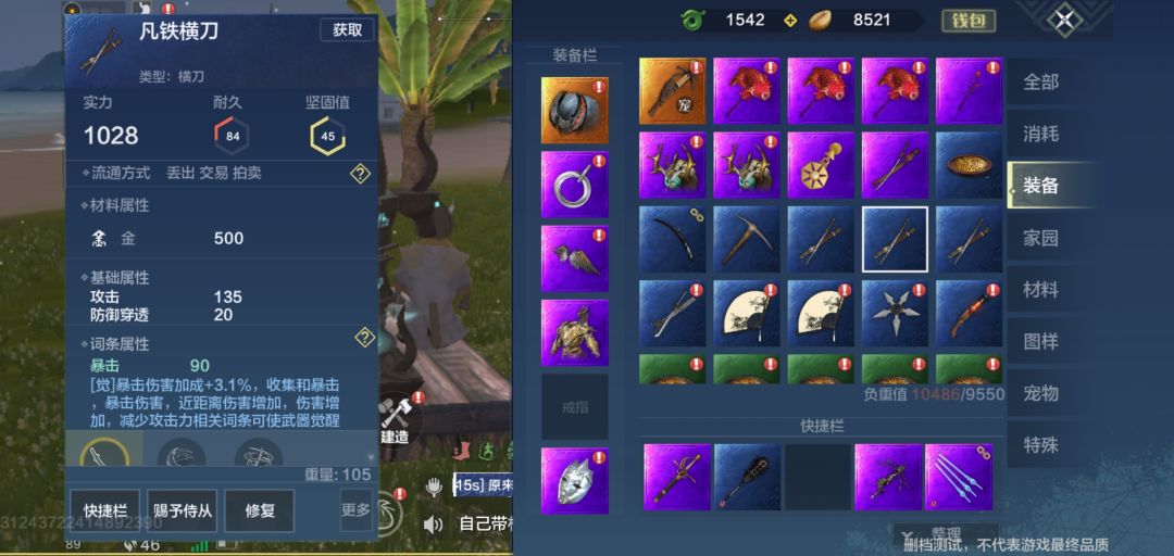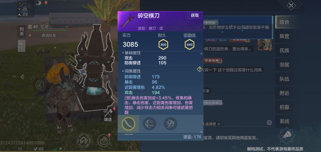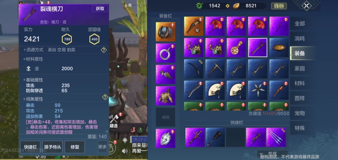 这是一把紫色横刀的觉醒条件,暴击+48就是它的觉醒效果。而后续的则是他所需要的前提觉醒条件,收集完合适的词条之后,便可以在炼器台觉醒……