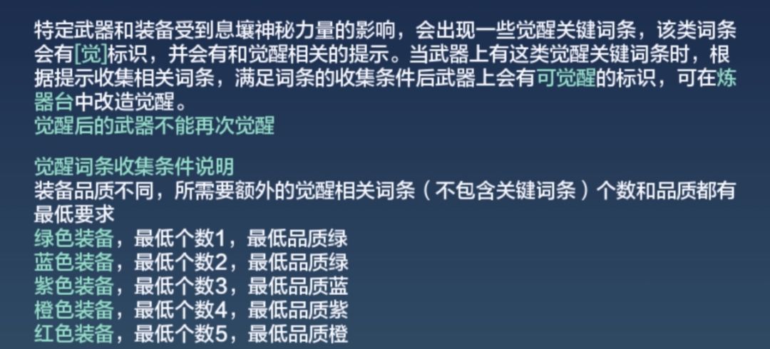 说实话,对于觉醒我还是保持观望态度。以当前版本的情况来看,除非他觉醒时候会大幅度增强该武器的基础属性,否则他对于玩家来说是锦上添花,但很难是雪中送炭。没有必要为了一个觉醒词条花费大心力去收集改造词条,如果能够在不影响本身战斗力的情况下觉醒那自然是好的,可无脑的去收集词条觉醒,浪费贝币不说,运气不好,你需要庞大且相同的装备数量,以紫色装备来说,他所需要的蓝色以上词条最少也是出现在蓝色装备上,想要批量获得需要紫色武器。就算你有刷出蓝色以上的词条,你还不敢保证他是你需要的。这玩意儿看看就好,在没有完全确认它的作用之前,大家还是不要去当这个吃螃蟹的了,探索交给大佬,我们只管跟随。![[嗒啦啦2_吃瓜]](https://img.tapimg.com/market/images/6eb1d083dff1c09692102cb5a98727f3.gif)