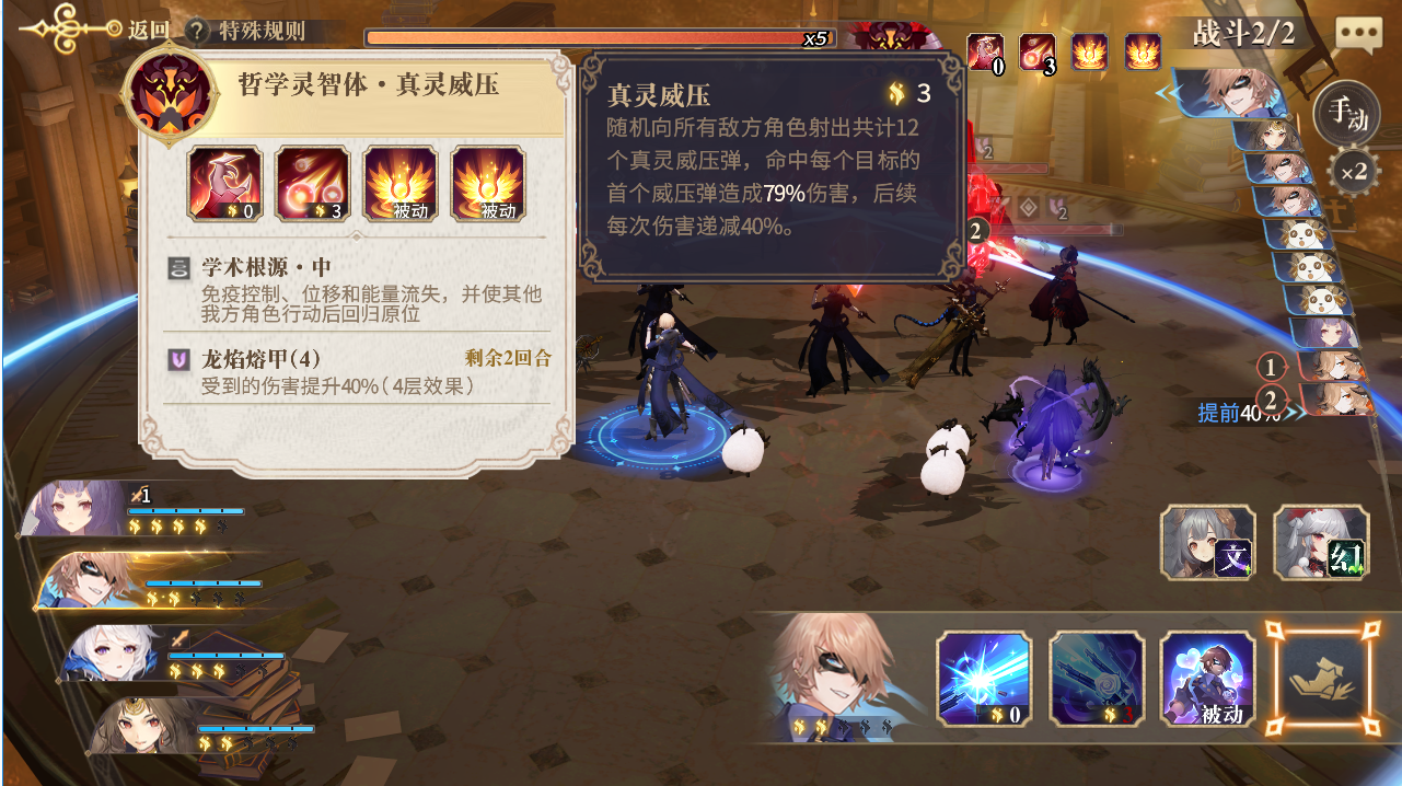 第二面的小怪是4名《无名童话》无名童话,普通攻击是小范围伤害,拥有爆炸效果,技能则是直线伤害。BOSS是哲学灵智体,普通攻击能击退我方角色,技能消耗3点能量,效果是释放出12个真灵威压弹,随机选择目标,伤害递减。灵智体还有两个被动技能,免疫控制、位移和能量流失,会使他的己方角色行动后回归原位,且每有一名爪牙死亡,BOSS就会损失20%的生命。这个被动技能就意味着我们必须拼伤害,不能靠强控阵容慢慢消耗敌人,且只需击杀4名爪牙再消耗掉BOSS20%的血量即可胜利。