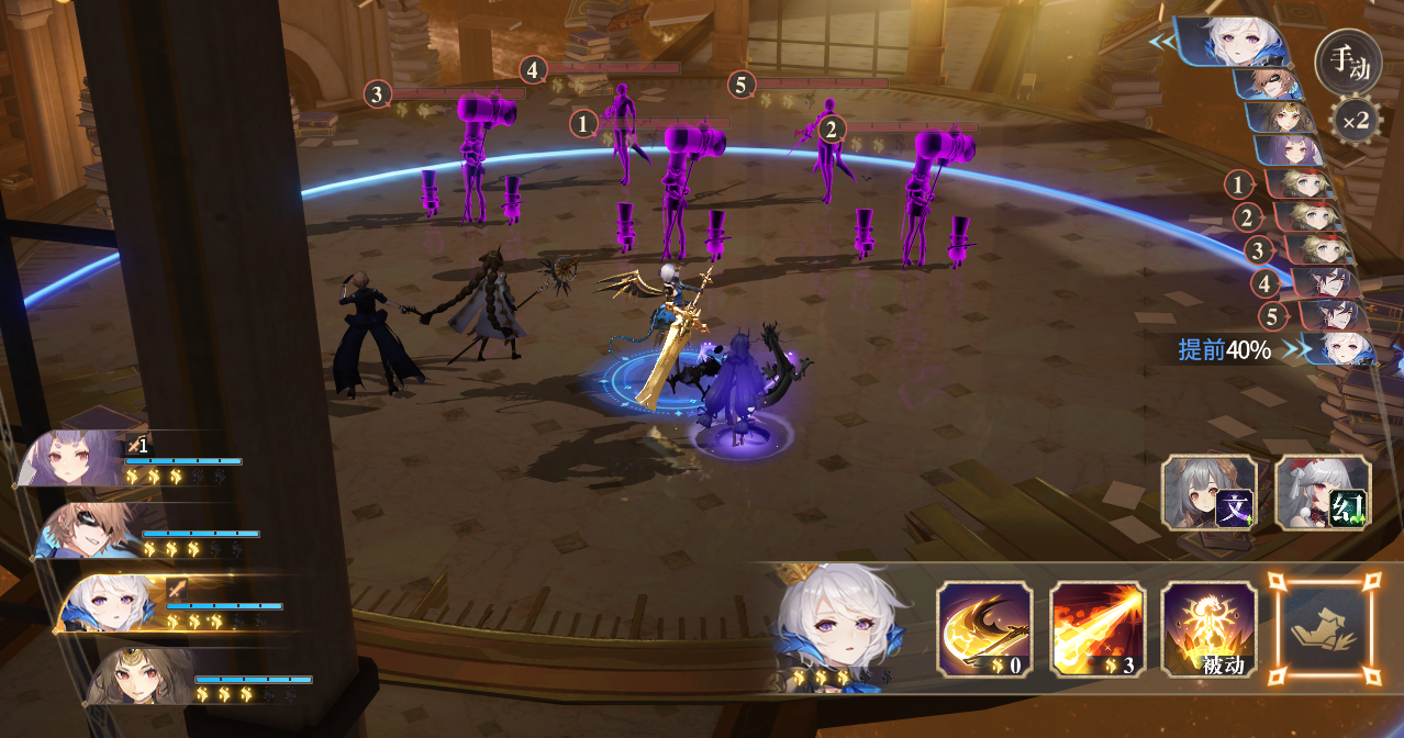 哲学思辨第一面怪物为3位《胡桃夹子》纳兹和2位《德古拉》德古拉,坦度不高,有很强的范围伤害,所以要尽量在对手出手之前就秒掉他们,保证能有一个健康的血量进入第二面。敌人呈正梯形站位,大范围技能都可以全部覆盖,小范围技能就需要先聚怪再输出。