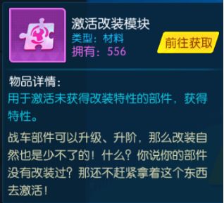 对于原本无额外属性,但是我们想添加的话,需要用到激活改造模块来激活获得特性。激活之后属性不满意怎么办呢,我们可以用到基础改装模块来刷新特效,小声跟你们说,刷新的属性是随机的哦,不过你会发现属性虽然是随机的,但是后面会越刷越高,甚至达到百分百的属性加成。到达百分百的属性加成之后又不满意,那么没办法了只能使用辐热改装模块要刷新自己想要的属性了。