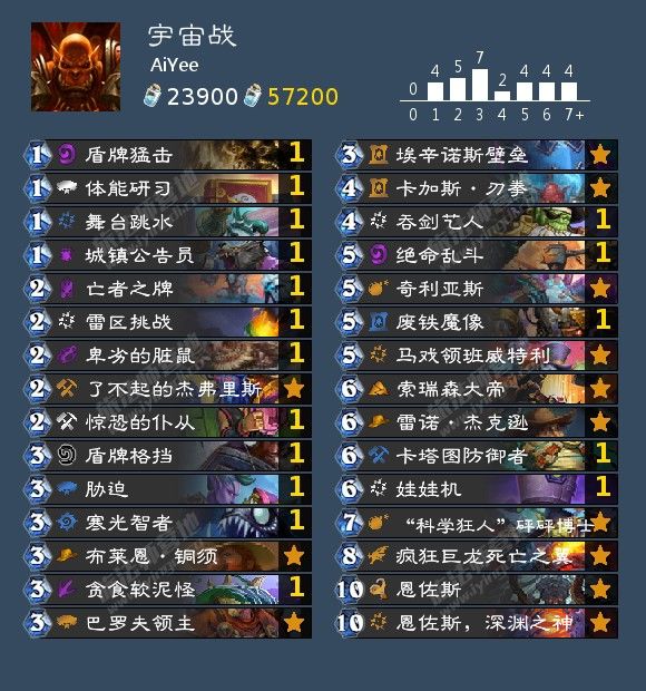 来自 AiYee的一套宇宙战,他以65%的胜率打上了传说。这是一套以双恩佐斯为核心的宇宙战,随从以优质突袭嘲讽的种族随从为主。由于宇宙卡组普遍吃牌序,所以携带的单卡质量不低,其他的就是解卡与过牌。新卡马戏领班威特利能直接补充手牌资源与过滤牌库,雷区挑战则是优质的低费解牌。机械携带了奇利亚斯,废铁魔像和娃娃机。海盗带的吞剑艺人,龙则是选择了疯狂巨龙,都是超模单卡。由于这套宇宙战以场面为主,并没有什么叠甲牌,故血量其实比较重要。