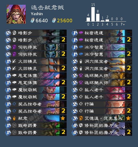 打法上起手留狐人老千,弑君/洞穴探宝者,有老千留行骗,火羽精灵甩笔侏儒和魔杖窃贼。连环腿大师对阵慢速可保留一张,通常情况下不留。火羽精灵和甩笔侏儒在对阵版本热门奇数骑时可以起到很好的解场和站场作用。对于连环腿大师的使用通常是第一张能刷到一两张就会交,如果有暗影步就收回,不需要等到高费贪过多的组合,那样反而会卡自己的节奏,第二张一般会类似珠宝师那样进行大幅度的刷取资源。因为连击池的特性再加上甩笔侏儒的加持,经常会打出一些操作感极强,出乎意料的斩杀。总体来说这套思路不错还兼具强度,欢迎小伙伴们前来尝试。