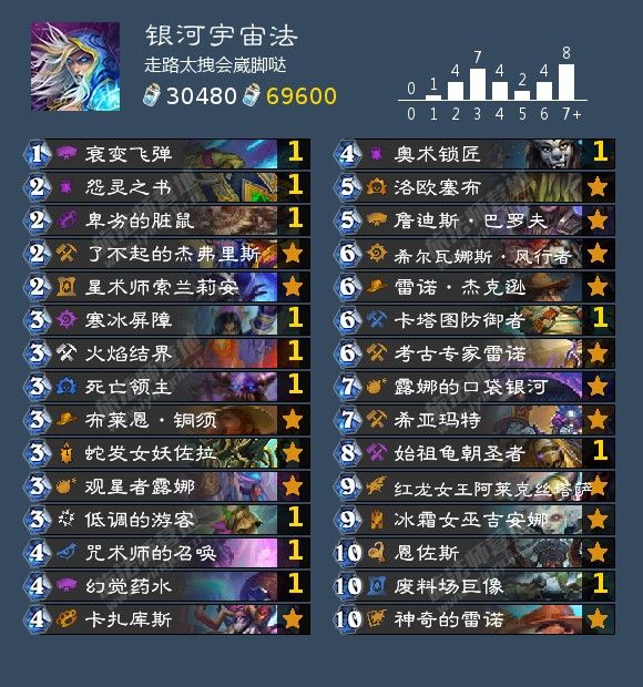 来自 走路太拽会崴脚哒 的银河宇宙法,他以57%的胜率打上了传说,卡组兼具娱乐与强度。卡组思路是开银河超展开,配合塞布回手等给压力,靠质量碾压 。我们准时银河基本上控制卡组就可以跑了。银河减费到塞布废料场巨像恩佐斯红龙等,对面也很难处理。卡组选择亡语体系是因为还打快攻一点,且对阵大哥牧胜率高一些。