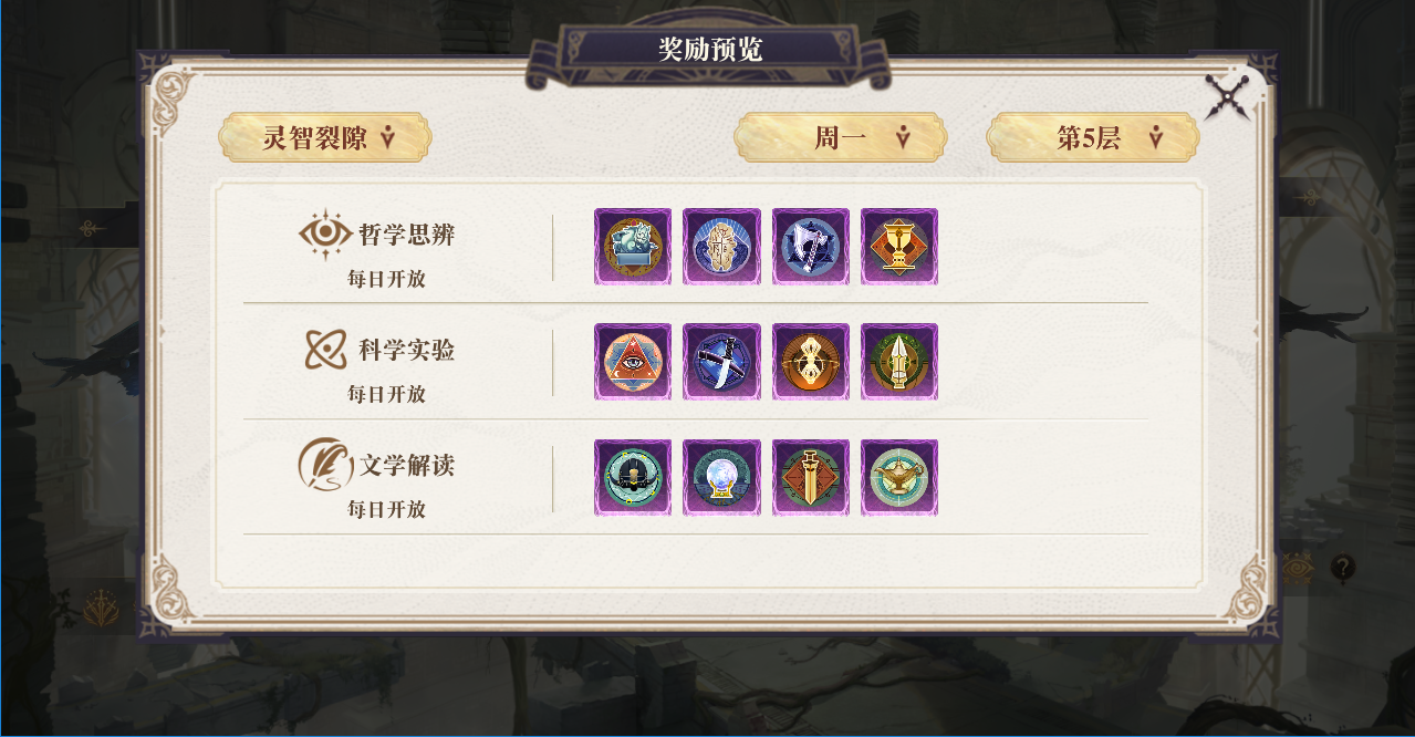 灵智裂隙共分为3中类型,分别为哲学思辨、科学实验、文学解读,这3种类型能爆出的契印纹各不相同,所以一定要明白自己所需要我的契印纹需要刷哪个类型的副本,然后投入灵感和时间,耐心刷,总会爆出理想的契印纹。